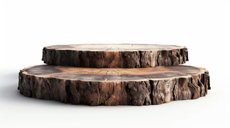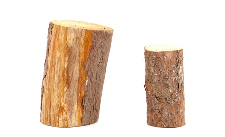 two wooden slices of oak tree branch showing growth rings isolated on white background.