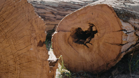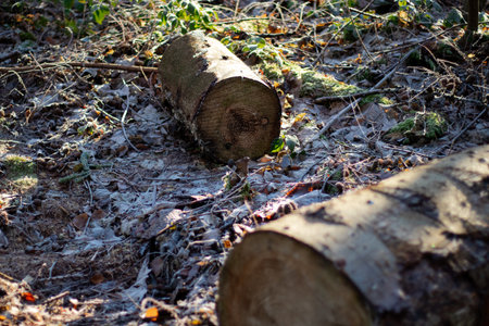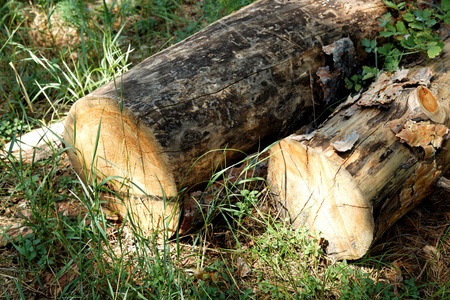 Two sawn logs lying on the ground, concept of forest deforestation.