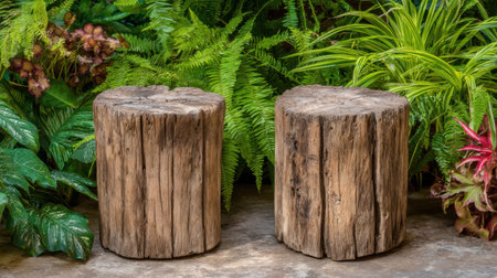 Two rustic wooden stools sit harmoniously amidst vibrant green plants, creating a serene outdoor atmosphere ideal for relaxation and tranquility.