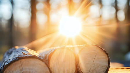 Warm sunlight glows softly through tree branches, casting light on stacked wooden logs.