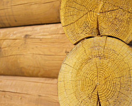 fragment of an old wall closeup from wooden logs of beige color and a blank space