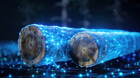 This image showcases a close-up view of wooden logs enhanced with digital light connections, symbolizing the fusion of nature and technology.