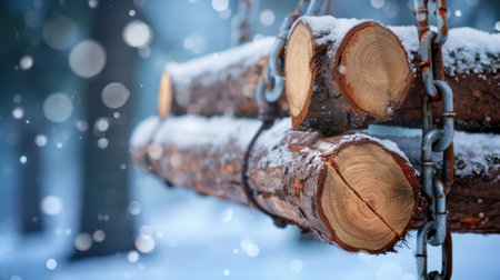 A close-up image of logs hanging on chains in a snowy forest. Soft snowflakes fall gently, creating a serene atmosphere perfect for winter themes.