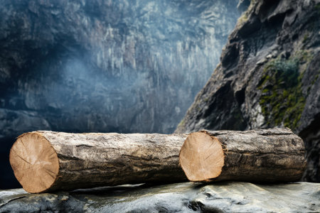 Two wooden logs are placed on a rocky surface amidst a serene mountain backdrop with light mist.