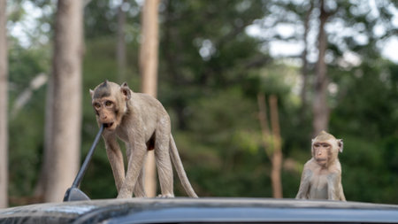 monkeys are playing on the car of the people, feeding them, for finding food at the park.