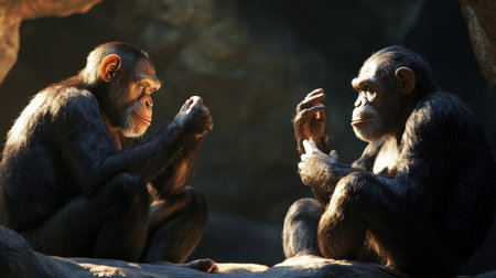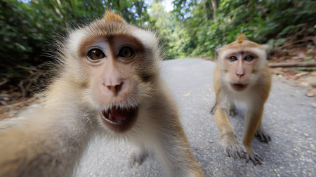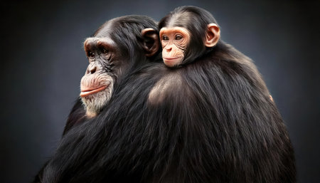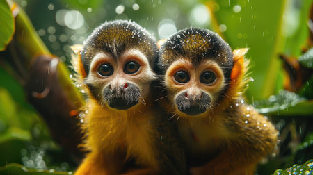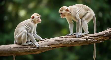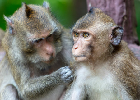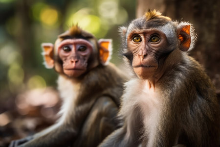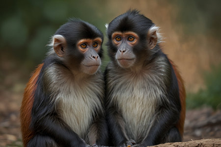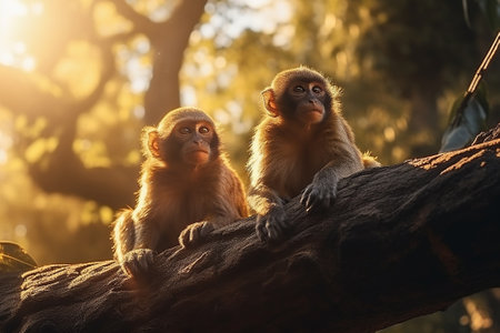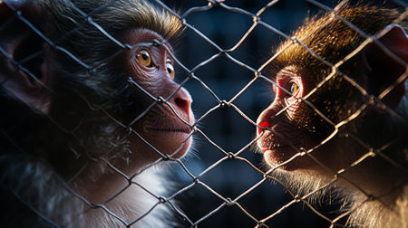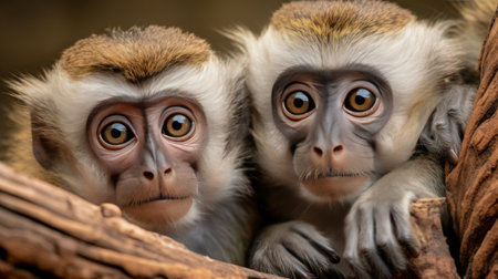 Two monkeys share a tender moment, illustrating affection and connection. Their innocent expressions highlight the beauty of wildlife companionship and intimacy.