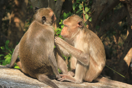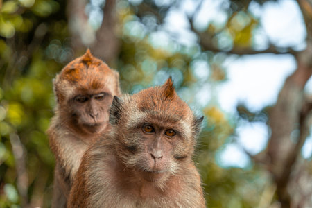 Two chimpanzee monkeys in the forest near the big buddha statue in thailand on phuket island