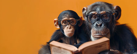 Two intelligent-looking monkeys wearing glasses, engrossed in reading a book, symbolizing curiosity and intelligence. High quality photo
