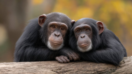 This captivating image showcases two chimpanzees resting closely on a log, set against a backdrop of warm autumn tones, highlighting their bond and peaceful demeanor.