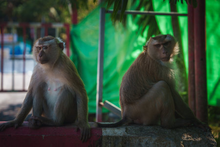 Two Macaques Resting on a Concrete Wall in a Tropical Setting