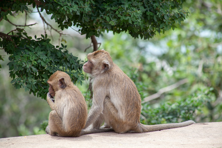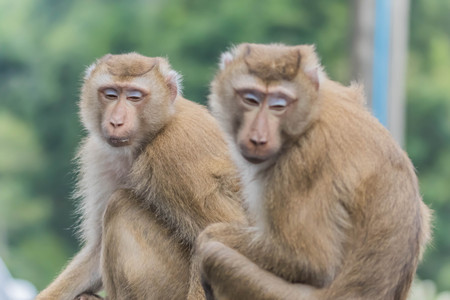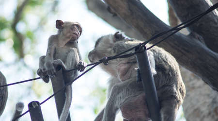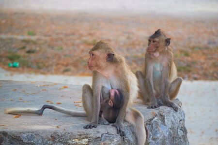 Monkey family eat the food that people bring. Monkey act The monkeys live in the mountains beside the shrine. Chonburi