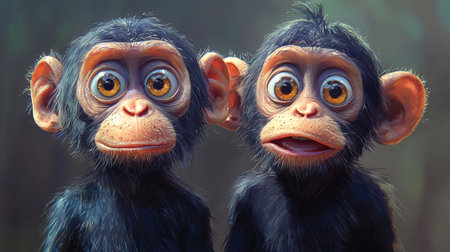 This charming illustration features two cartoon chimpanzees with large expressive eyes, set in a vibrant forest backdrop. Ideal for playful projects.