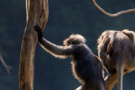 A primate mother is joyfully cradling her baby on a tree branch in the lush jungle. Both covered in fur, they are delighted in their natural habitat
