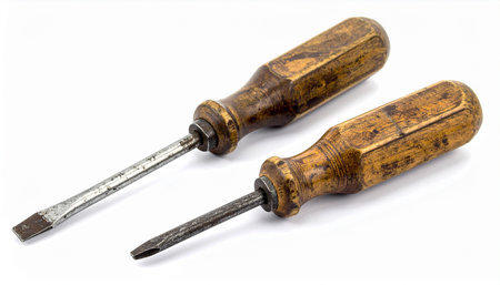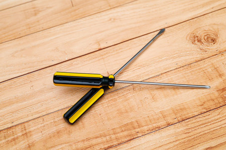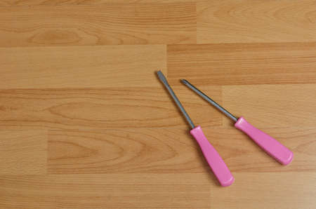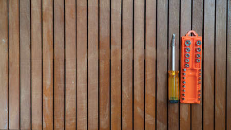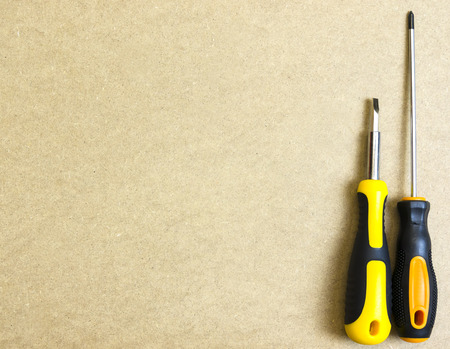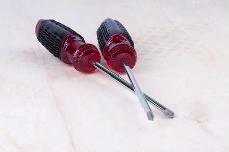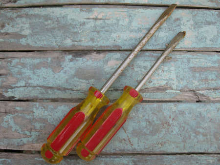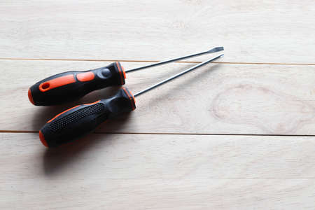 Repair background with red and black screwdrivers on distressed wood background with copy space for home repair or maintenance message