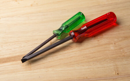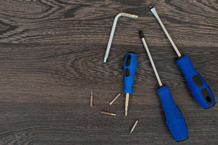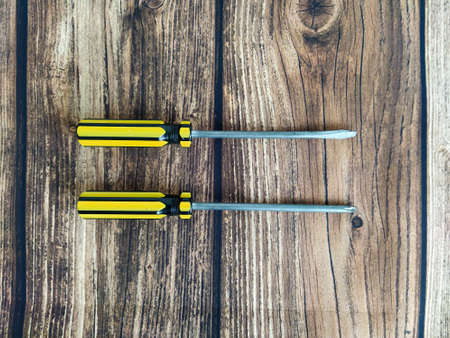 Top view and close up: Builder, repair and construction hand tool concept. There are screwdrivers on wooden table background.