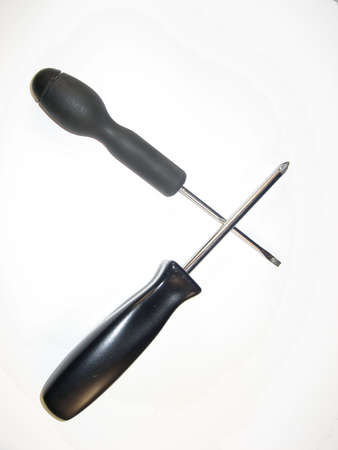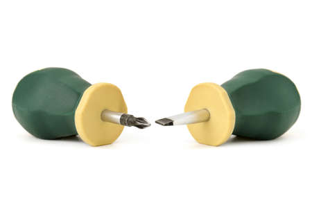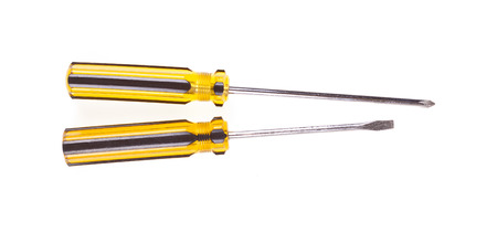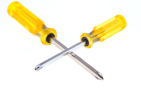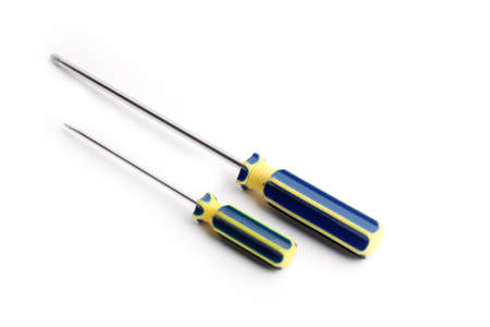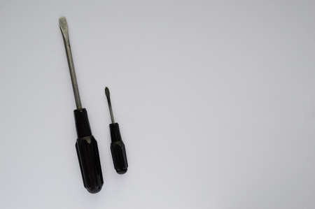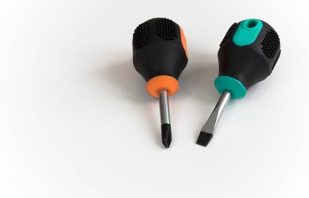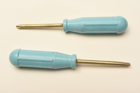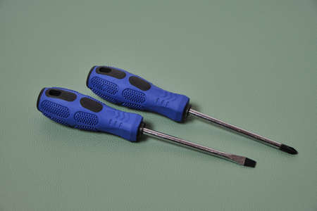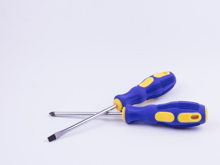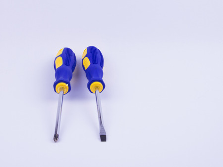 Two screwdrivers with blue handles lie opposite each other on a white background on top with space for text. The concept of repair, twisting. High quality photo