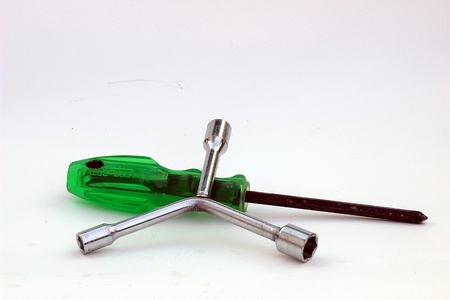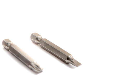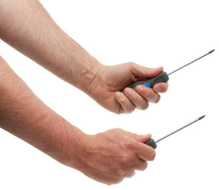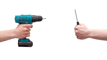 Male hands with a cordless screwdriver and cruciform hand screwdriver. Hands isolated on white background
