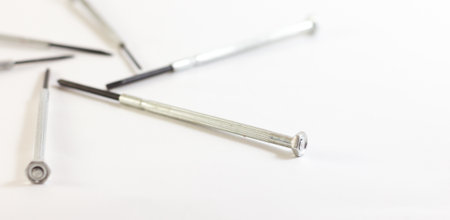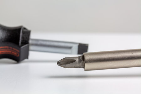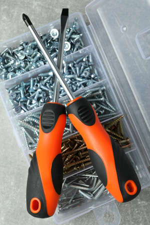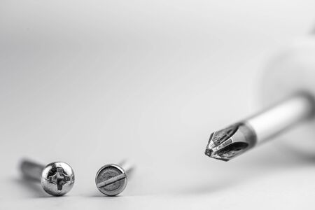 close up of screwdriver are cross and different screws. Tools. Compatibility. Repair. copy space. black and white photography