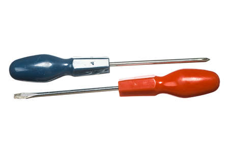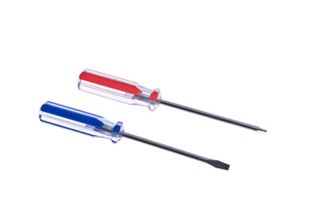 pair of steel screwdrivers with transparent plastic handle with red and blue color on white background