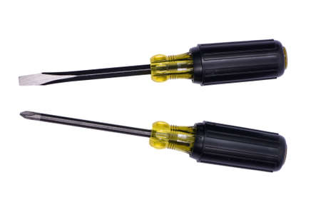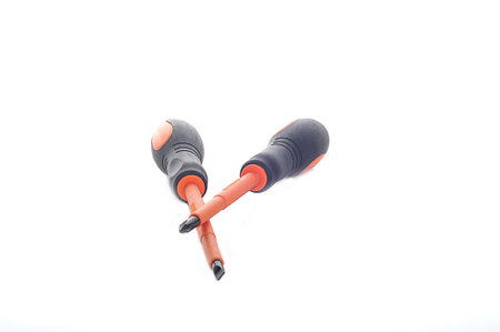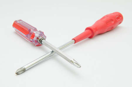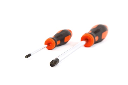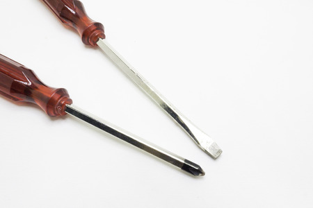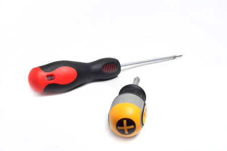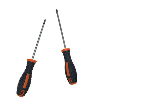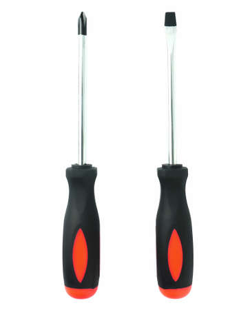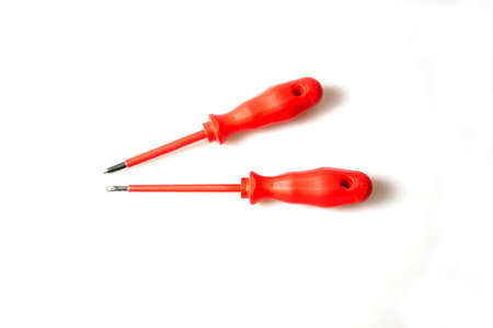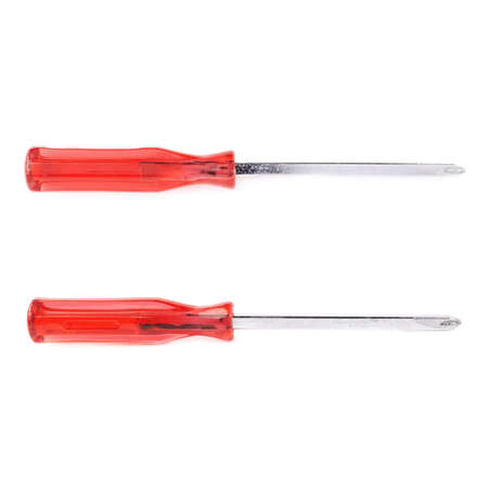 Close up Screwdriver, metal tool, plastic handle, red-black, for repairing, isolated on white background.