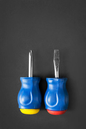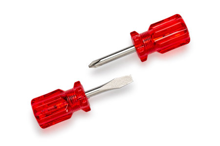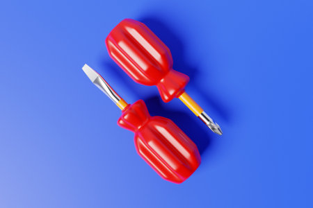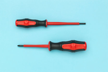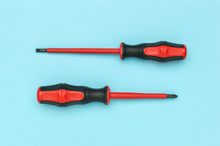 Top and Side View of Red and Black Screwdrivers on Blue Background