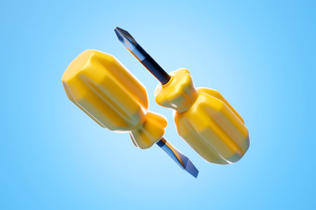 3D illustration of a yellow screwdrivers in cartoon style on a monochrome isolated background. Hand carpentry tool for DIY shop.