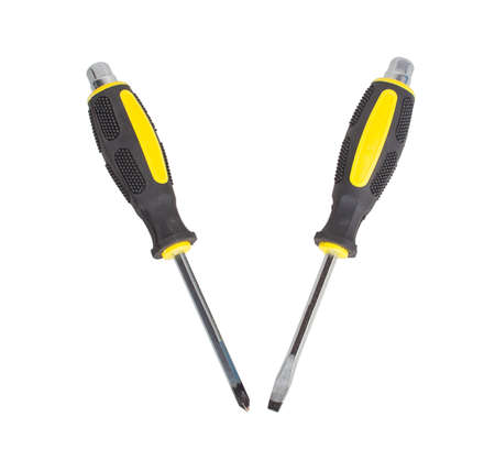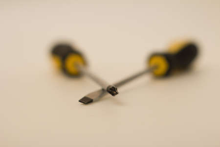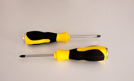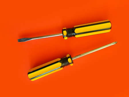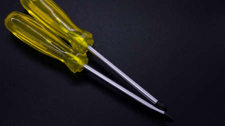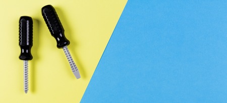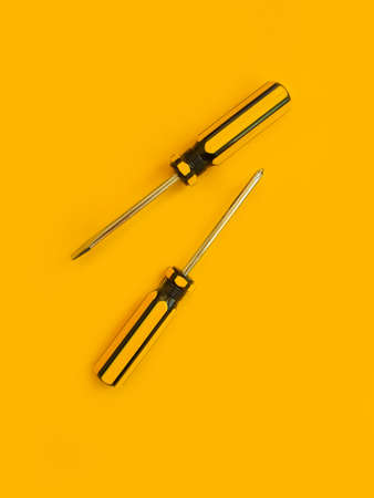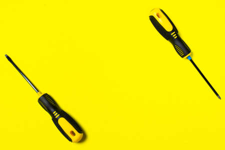 Two black and yellow screwdrivers on a yellow background with space for text. Tools, construction and workshop, home repairs, slusar work