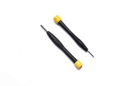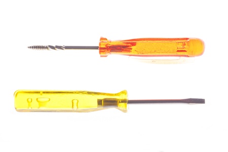 Yellow screwdriver and small multi-bit screwdriver on a black background