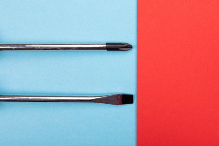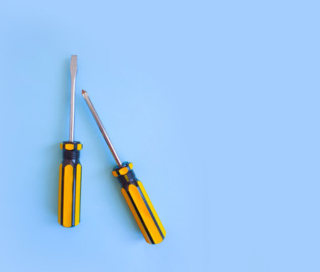 Home improvement: two screwdrivers on a blue and white flat lay background with copy space.