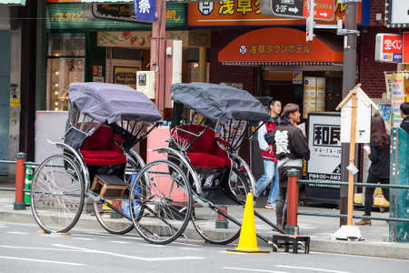 TOKYO, JAPAN - CIRCA APR, 2013: Two rickshaws stand on the road for tourists riding in the Asakusa district. Asakusa district with Sensoji shrine is famous place for people visiting