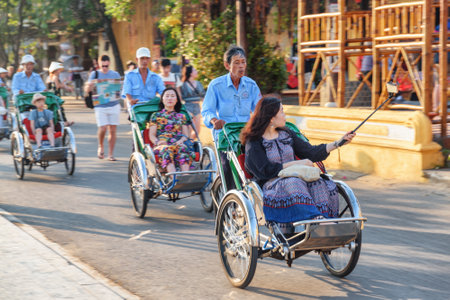 Hoi An (Hoian), Vietnam - April 11, 2018: Tourists riding trishaws (cycle rickshaws) around Hoi An Ancient Town.