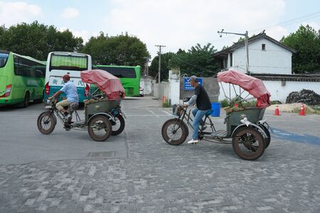Suzhou,China-September 17, 2019: Traditional Chinese touring cycle rickshaw in Suzhou, China