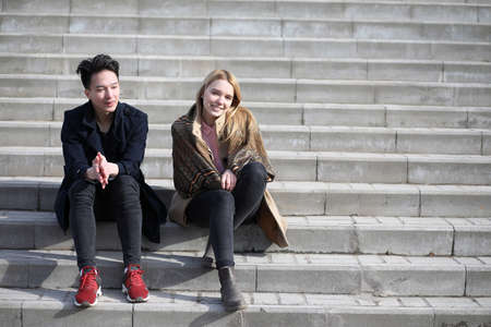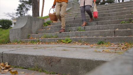 Couple down stairs in the park. Couple in love down stairs made of stone holding hands. Young beautiful couple, down from the stairs, holding each others hands.