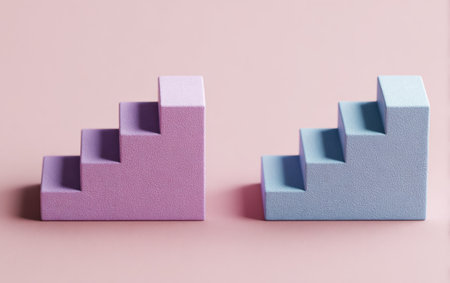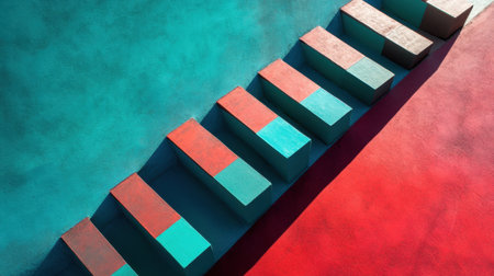 This artistic image features colorful geometric steps in vivid hues, creating a strong visual contrast against a textured background, ideal for modern design projects.