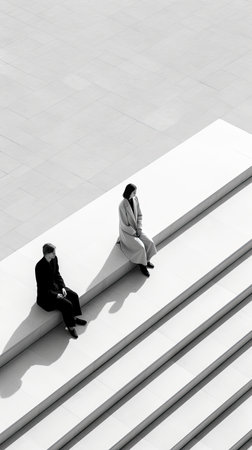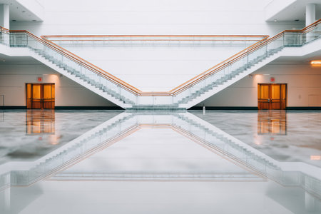 This image showcases a modern architectural interior featuring a symmetrical staircase design. The scene includes a reflective floor, geometric shapes, and a bright, neutral color palette. The composition may be suitable for commercial use. The interior is well-lit and visually appealing. The overall style is clean and contemporary, possibly ideal for diverse visual projects.