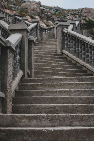 An old stairway of steep concrete stairs with round concrete pillars as a railing.