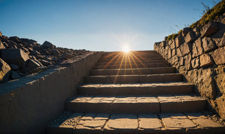 Stone steps lead up to a bright sun shining through a clear blue sky