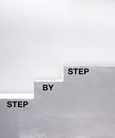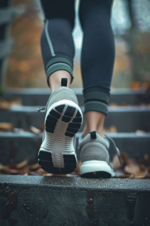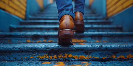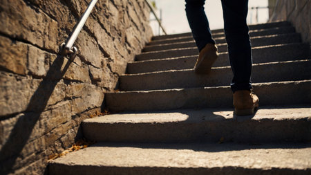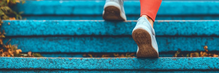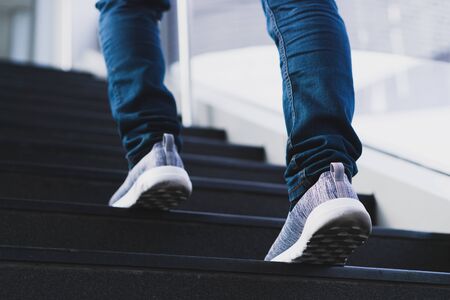 A person is walking up a set of stairs in their white shoes. Concept of determination and focus as the person climbs the steps