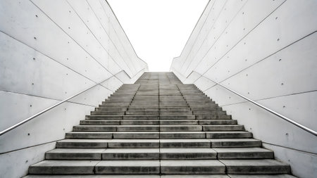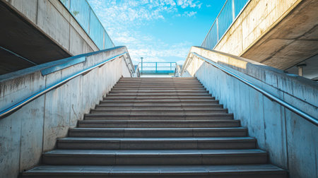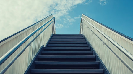 An upward view of sleek stairs leading towards a bright blue sky, creating a sense of aspiration and motivation, ideal for themes of progress and achievement.
