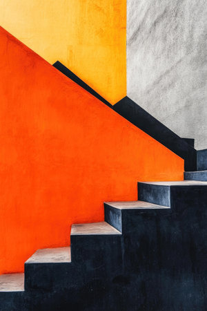 Minimalist, modern aesthetic with a focus on geometric shapes and lines. The background is an orange wall, with dark blue stairs leading up to it. The color palette includes shades of gray for the walls, black for the staircases, and bright yellow accents. This design embodies simplicity in form yet energy through dynamic colors. --ar 2:3 --v 6.1 Job ID: 57515b4a-19da-4b48-86d0-d7453f65b0f8