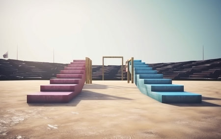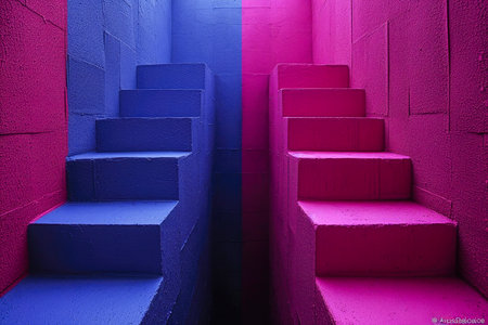 Two sets of stairs ascend within different colored environments, purple and blue. The composition highlights geometric forms with hard lighting. This visual could represent decisions, progress, or opposing concepts. Suitable for editorial illustrations, graphic design, and concepts of choice and paths.