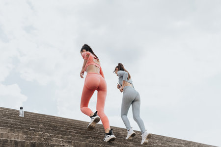 Active sporty girls exercising on stairs in urban environment, showcasing fit and healthy lifestyle.