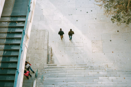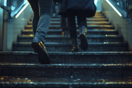 Dynamic perspective of a man in formal attire walking up textured stairs, emphasizing motion and the pace of urban life