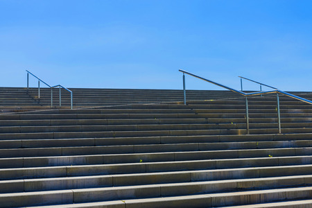 Sturdy concrete stairs rise toward a bright blue sky, surrounded by modern architecture. The scene invites exploration and offers a sense of openness, encouraging upward movement and curiosity.