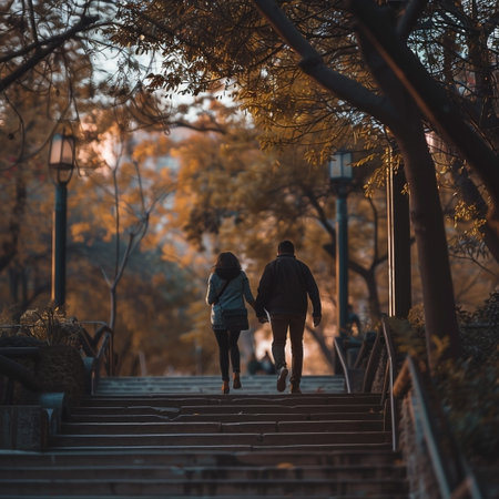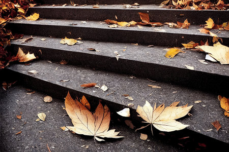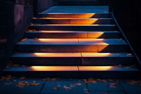 Warm light highlights each step of a staircase in a city setting, surrounded by fallen leaves, creating a tranquil atmosphere during the evening.
