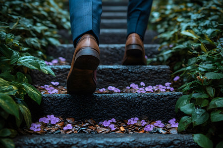 A businessman, visible from the back, climbs stone stairs surrounded by lush greenery and scattered purple flower petals. the focus on the shoes and vibrant foliage suggests themes of progress, journey, and nature. Generative AI