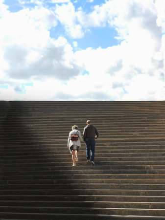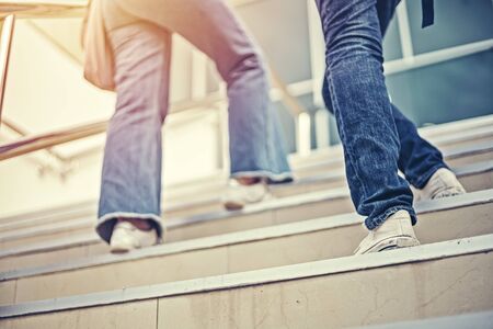 Walking up the stairs to lose weight, Walking up to goal, with vintage filter
