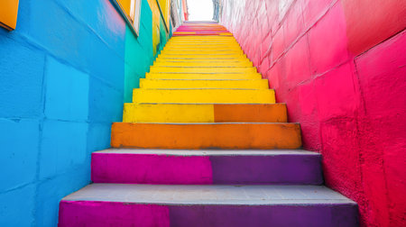 Brightly colored stairs lead upwards in a vibrant urban setting filled with artistic charm and playful hues during daylight