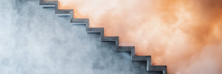 Concrete stairway rising towards a smoky orange sky, evoking a dramatic and surreal atmosphere filled with mystery and the promise of ascension into the unknown