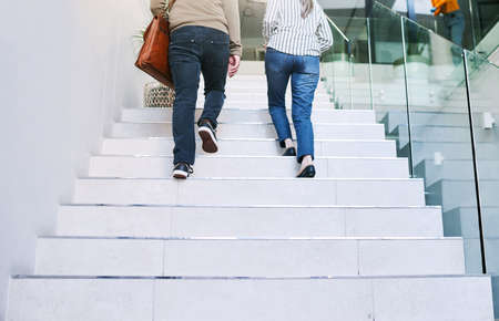 Business people climb the steps of the city stairs. impersonal rising up. Career growth and advancement. Increasing and improving skills. Salary increase